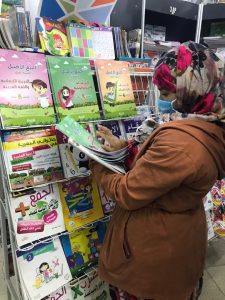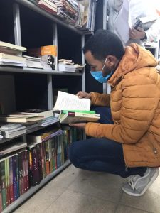 Nuestra primera parada fue en una enorme librería de tres plantas y nos dio mucha alegría comprobar que sabían quiénes éramos, puesto que ya habíamos estado comprando libros en ella el año pasado. Nos sorprendió que aun se extrañaran de que haya un proyecto de bibliotecas en los campamentos de refugiados y de que estuviéramos allí comprando libros, teniendo en cuenta las circunstancias actuales de nuestro pueblo. Después de conversar con ellos sobre todo esto, les encargamos un listado de libros y nos fuimos a otra librería. Y a otra. Y a otras tres. En todas fuimos encargando libros que los lectores nos habían ido pidiendo tanto en las bibliotecas como por WhatsApp. No fue fácil encontrarlos, porque este año, por culpa de la pandemia, no hubo feria y les costó más trabajo localizar las novedades. Pero, al final, lo conseguimos y hemos regresado a los campamentos con 23 cajas llenas de cuentos infantiles, novelas, algunos libros nuevos de religión, diccionarios, libros de filosofía, de ciencias naturales y de salud, que es un tema del que se hacen charlas en todas las bibliotecas. También compramos libros para preparación de clases, que nos pidieron varios profesores y algunos libros enfocados a la atención de personas con discapacidad. En definitiva, libros interesantísimos que atraerán no solo a los niños, también a los jóvenes, a los adultos y a profesionales de la medicina, psicólogos, maestros…