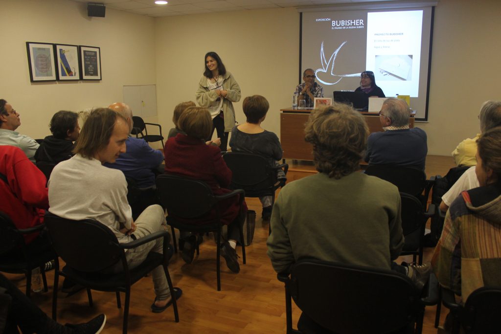 Liman Boisha y Mónica Rodríguez explicaron este milagro por el que han florecido cuatro bibliotecas en los campamentos de refugiados de Tindouf: cómo se inició, desde la sencilla e inocente idea de un escolar gallego hasta la reciente inauguración de la biblioteca del campamento de refugiados de Dajla; cómo se trata de un proyecto en el que los bibliotecarios y bibliotecarias son saharauis, apoyados en sus actividades de promoción de la lectura por voluntarios que acuden a desarrollar las más variopintas tareas (kamishibais, teatro, dibujo, fotografía, pintura, talleres de lectura, divulgación de la ciencia…)