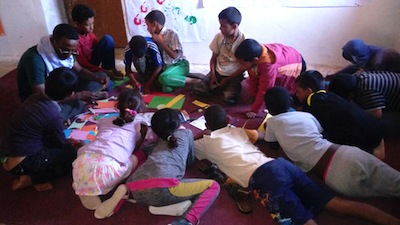 La fiesta propiamente dicha empezó con un saludo y un vídeo con el que les fuimos explicando a los niños y niñas el porqué de la elección del 23 de abril como Día del Libro, al tiempo que les lanzábamos preguntas sobre la importancia de la lectura, para estimular su participación. Los encargados de organizar esta primera parte fueron Brahim y Madja.