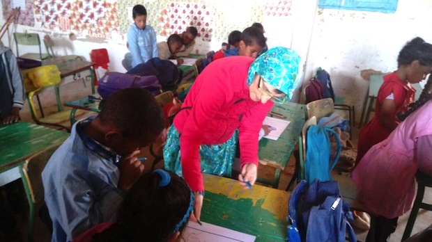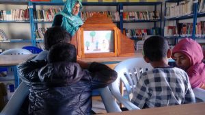 Tanto en las escuelas como en la biblioteca, los niños dibujan y cuentan, usando el butai (teatrito de madera), sus propios kamishibais y Gajmula y Aziz practican con éxito esta técnica a la que “le estamos cogiendo mucho gusto”, dicen.