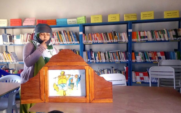 Tanto en las escuelas como en la biblioteca, los niños dibujan y cuentan, usando el butai (teatrito de madera), sus propios kamishibais y Gajmula y Aziz practican con éxito esta técnica a la que “le estamos cogiendo mucho gusto”, dicen.