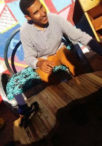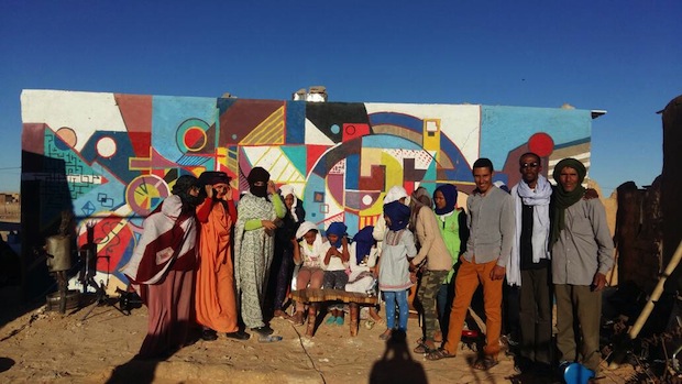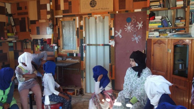 Mohamed Suleiman., el joven artista saharaui que colaboró con Inés en la decoración de las fachadas de la biblioteca de Smara, recibió ayer en su estudio, Motif Art, a un nutrido grupo de estudiantes de secundaria . Esta visita, impulsada por los bibliotecarios Bubisher, resultó de gran interés para los chicos y chicas que pudieron admirar la obra de este artista independiente.