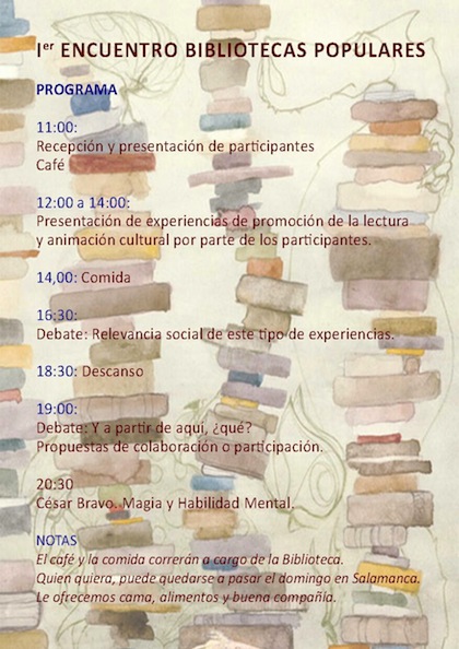 El próximo sábado , 3 de febrero, tendrá lugar en Salamanca el Primer encuentro de Bibliotecas Populares, una iniciativa que pondrá en contacto experiencias novedosas en el mundo de las bibliotecas.