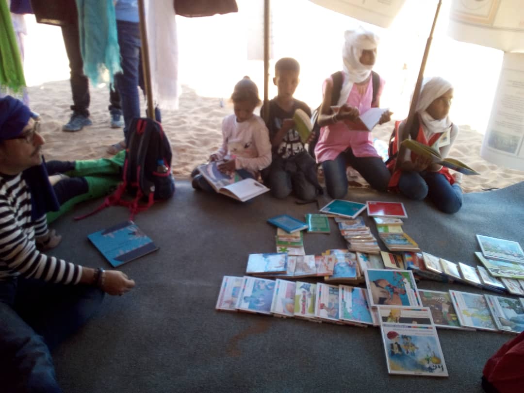 La jaima del Bubisher se llenó esta mañana. Niños y niñas saharauis disfrutaron de la lectura de cuentos; españoles y personas de otras nacionalidades se empaparon de la filosofía del Bubisher, la alegría se instaló entre todos ellos y disfrutaron de una jornada inolvidable.