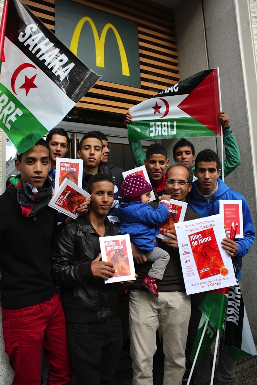 Eran las 11:ooh de la mañana cuando el equipo bubishero madrileño hacia acto de presencia en la calle Atocha. Mesa de campig, maletas llenas de libros, melfas, bandera saharaui…y muchas ganas de lanzar la buena nueva.