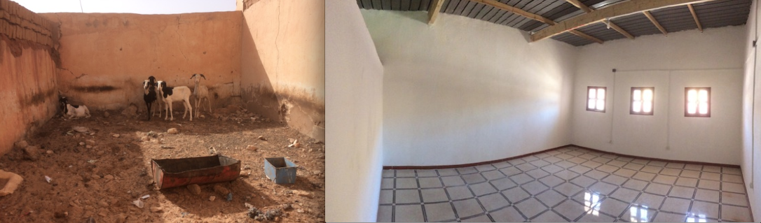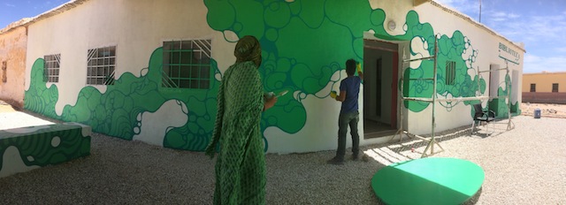 Con dos picos, dos palas, dos mazas, una carretilla y una radial, dos jóvenes saharauis impresionantes, Skeirid y Hasana, asesorados en todo momento por Rogelio Martín, el arquitecto español que diseñó la nueva estructura del edificio, y acompañados y apoyados casi minuto a minuto por Suadu (nombre en hasanía de Inés), han conseguido lo que a quienes vimos el espacio inicial nos parecía imposible: transformar unas ruinas en un espacio bellísimo (palabras textuales de Hamida, nuestro coordinador general del proyecto) Y a ellos se unió Javier Arango, artista mejicano autor de la magnífica decoración de la fachada.