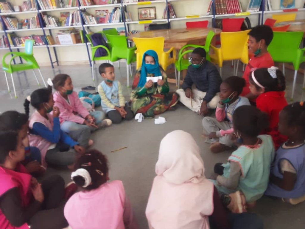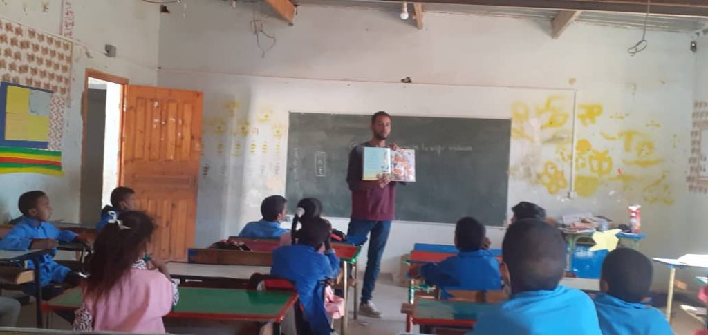Al mismo tiempo, y en un colegio de primaria de Bojador, Alghailani leía el cuento “La sonrisa es la mejor medicina” e invitaba a los niños a pensar en cosas que les hicieran sonreír y alejarse de la preocupación que les produce el conflicto armado.
