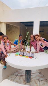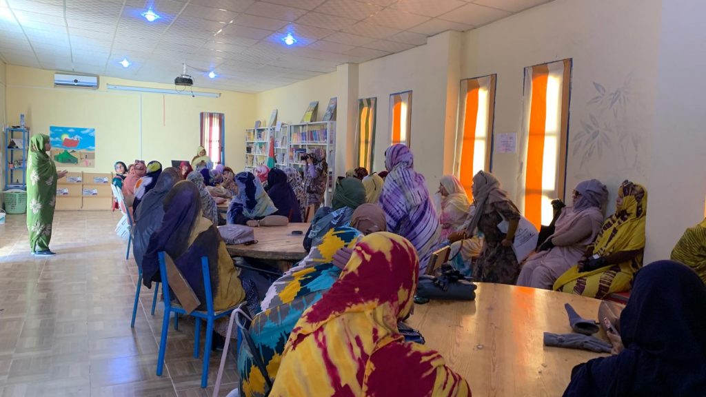 En nuestro último día en la biblioteca de Smara apareció de repente un grupo de unas 35 mujeres jóvenes en edad de elegir estudios, acompañadas por la tutora del proyecto. Venían a participar en una de las sesiones del taller que iba a tener lugar en la misma biblioteca, con el objetivo de escuchar in situ cómo es el trabajo de una bibliotecaria y en aquel caso de conocer también su formación adicional, trabajos y vivencias como artista. El taller consistía en visitar diferentes lugares de trabajo en Los Campamentos para recibir esa información directa, conocer referentes laborales femeninos y motivarse para poder elegir ellas también su formación … “libremente”… sería nuestra coletilla aquí, claro, porque allá no. Allá llegar a la juventud es recibir un golpe bajo, mirar al futuro laboral y no ver la luz del túnel, y si eres mujer, el golpe podría ser doble.