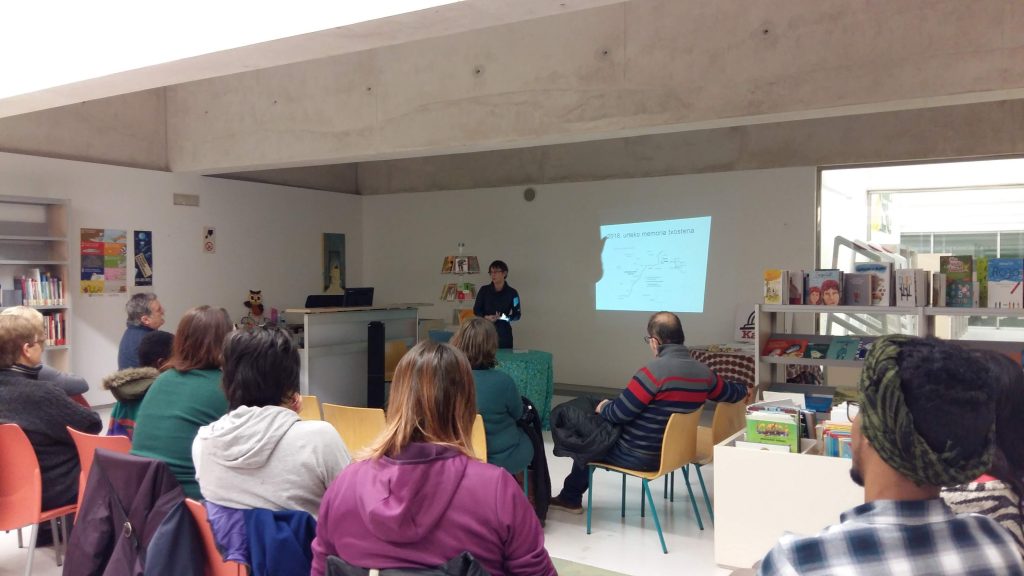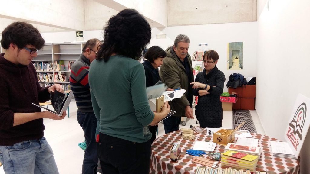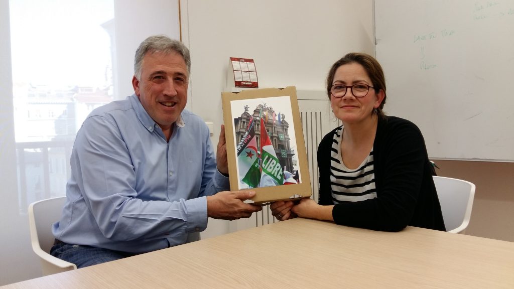Escribí a Joseba unas palabras de ánimo y agradecimiento por su entrega a Pamplona y su apoyo al pueblo saharaui. Revelé una fotografía tomada el último día de los últimos sanfermines en la Kalejira de las Culturas, que reivindica la igualdad de derechos para todas las personas con independencia de su origen, y la enmarqué; de fondo el Ayuntamiento de Pamplona, y en primer plano, las banderas claman Libertad para el Sahara Occidental. En la cabeza, como un archivo digital que no pudiera cerrar, estaba Saharako Kabiak, porque al día siguiente era este nido del Bubisher protagonista de la agenda cultural en la Biblioteca Pública Sanduzelai. Imprimí un cartel de la charla que habíamos preparado en Kabiak y se la entregué en modo invitación. Pude explicarle que Kabiak llevaba apoyo al Bubisher, el proyecto que hace posible que en los campamentos de refugiados haya acceso a la cultura desde una biblioteca o bibliobús. Y que estaba invitado a la presentación que al día siguiente tendría lugar. Muy agradecido, nos tomaron una fotografía en apoyo a la continuidad del Bubisher.
