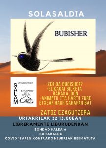 El pasado sábado 22 de enero tuvo lugar en la librería Libreramente de Barakaldo, Bizkaia, una charla organizada por el colectivo Salam. En la misma el proyecto Bubisher fue presentado por parte del escritor Josu Jimenez Maia de Saharako Kabiak-Nidos del Sahara, y se mostraron libros y diverso material.
