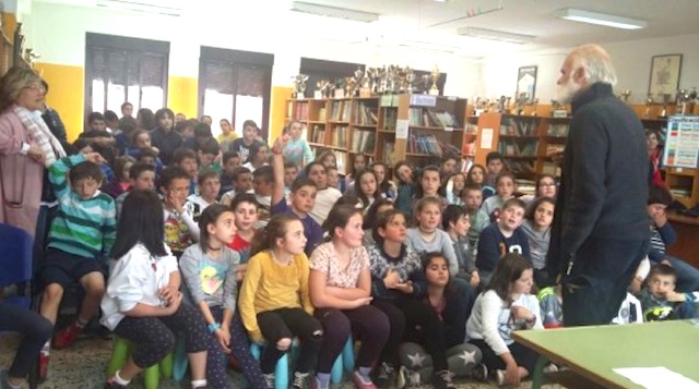 El escritor valenciano Gonzalo Moure, afincado en Asturias desde hace años, visitó esta semana el colegio público de Infiesto, donde participó en un encuentro con los alumnos, con el objetivo de presentarles el proyecto que impulsa, denominado ‘Bubisher’, y que se centra en el acercamiento de la literatura a los campos de refugiados saharahuis.