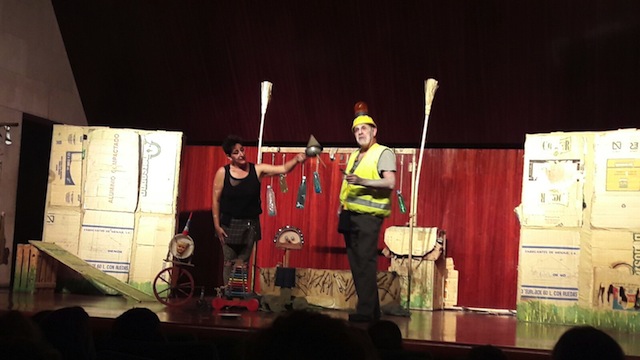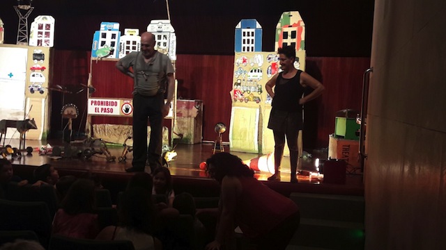 Las tormentas no impidieron que el salón de actos de la Diputación Provincial de Huesca se llenara de pequeños y mayores para disfrutar de los Titiriteros de Binéfar que, generosamente, representaban El hombre cigüeña. Entre el público varios muchachos saharauis que participan en el programa Estudios en paz.