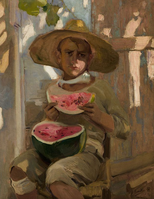 Sorolla pintó la luz. Pintó lo intangible: el alma, la herida, el alivio de la sed en la frescura de la sandía que sostiene el niño. Y nosotros, espectadores, advertimos en la pincelada suelta y ancha la violencia del sol que atraviesa un emparrado que no vemos, pero sentimos. La sombra protectora, la expresión incierta del niño, el vendaje en la rodilla.
