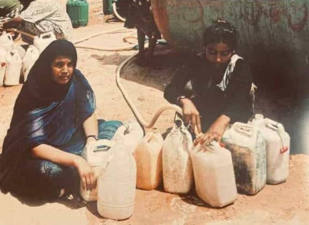 Desde los primeros días de la Revolución Saharaui, las mujeres han jugado un papel muy importante.  Muchas abandonaron sus hogares para escapar de los bombardeos de las fuerzas invasoras.  Tuvieron que caminar cientos de kilómetros a pie y soportar el hambre y el cansancio para llegar a zonas seguras con sus hijos, más allá de la frontera con Argelina.  Cuando se organizaron los campamentos de refugiados, fueron ellas las que tuvieron que construir escuelas y hospitales, debido a la ausencia de sus hermanos y maridos, que luchaban en la guerra.