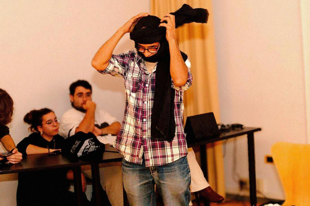 Pero además Liman se nos vino arriba y en un pis pas dio a los asistentes una clase práctica de cómo colocarse el turbante y nos habló de los múltiples usos de esta prenda que puede ser alternativamente cuna, cabestrillo, ronzal, ligadura, filtro solar, pañuelo, mascarilla e incluso contribuir a sacar a un vehículo de la arena.