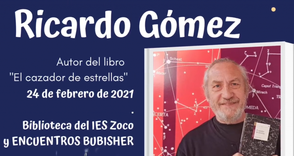 Por fin pudimos tener un encuentro con @Ricardo Gómez, el autor del libro del club de lectura de 1º ESO, «El cazador de estrellas». Desde aquí le damos las gracias por sus palabras, sus consejos para escribir y su manera de entender el compromiso de la escritura y de la lectura. Esto, sin duda, ha calado hondamente en nuestro alumnado que, además, ha podido conocer la realidad de los niños en los campos de refugiados del Sáhara. Gracias también al Proyecto Bubisher pues es en este marco donde ha sido posible este encuentro. Os dejamos unas imágenes y las palabras del escritor.