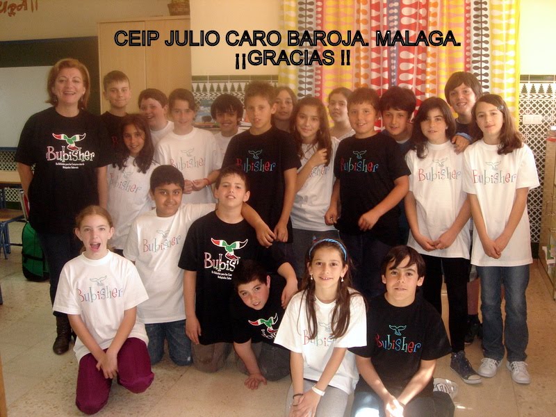 Lo que vemos arriba es una representación del CEIP Julio Caro Baroja, de Málaga. Este año han celebrado el dí­a del libro colaborando con el Bubisher, comprándonos muchas, muchas camisetas, como las que llevan puestas en la foto. Yolanda, la profe que se ha encargado del trabajazo de poner de acuerdo a tanta gente, nos decí­a que salió un dí­a estupendo de sol y calorcito, después del duro invierno que soportaron por tierras malagueñas. Un presagio, sin duda. Un poco de ayuda divina, para poder compartir el mismo sol del desierto y estar así­ más cerca del Sáhara.