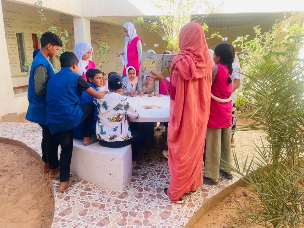 Por la tarde, cuando el sol empieza a declinar y el desierto se vuelve más amable, el patio–jardín de la biblioteca Bubisher de la Wilaya de Auserd, se transforma en un pequeño milagro cotidiano. Allí, entre paredes blancas tantas veces golpeadas por el siroco, parecen guardar el sonido del viento y mosaicos rosados que reflejan la luz cálida del atardecer, los niños se reúnen alrededor de una mesa circular. No es solo un círculo de cemento, sino un hogar momentáneo, un nido de palabras.