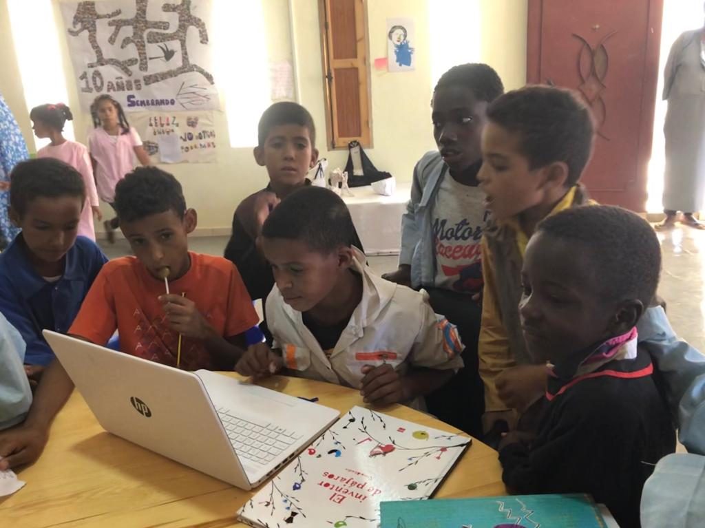 Hamudi es un joven usuario de la biblioteca de Dajla. Desde que se inauguró, ahora hace un año, Hamudi no ha dejado de participar en la vida de la biblioteca. Ayudó lo que pudo cuando se pintó la fachada,  va a la hora del recreo a leer un rato y por las tardes hace allí sus deberes escolares, se ha apuntado a un grupo de teatro y, además, ahí lo tenéis registrando un libro. Mirad, por favor, la cara de asombro del chaval de atrás. Hamudi será lo que quiera en su vida. Por ejemplo, bibliotecario del Bubisher. Porque los libros iluminan.