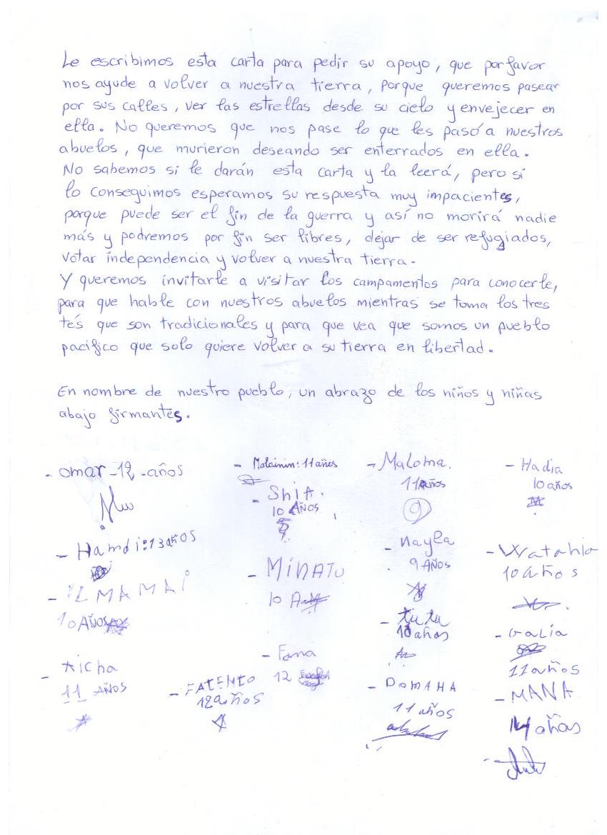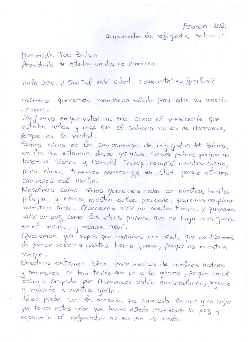 Ayer salió de la oficina postal de Tinduf, rumbo a la Casa Blanca, una carta firmada por más de doscientos niños saharauis en la que piden al nuevo presidente “que no haga como el anterior presidente” y declare que el Sáhara Occidental no es marroquí. Tras lamentar que sus padres y hermanos se hayan tenido que “ir a la guerra” por la represión en los Territorios Ocupados del Sáhara, los niños invitan al nuevo presidente a visitar los campamentos, en los que viven los saharauis desde hace 45 años, y a compartir con ellos los tres tés.