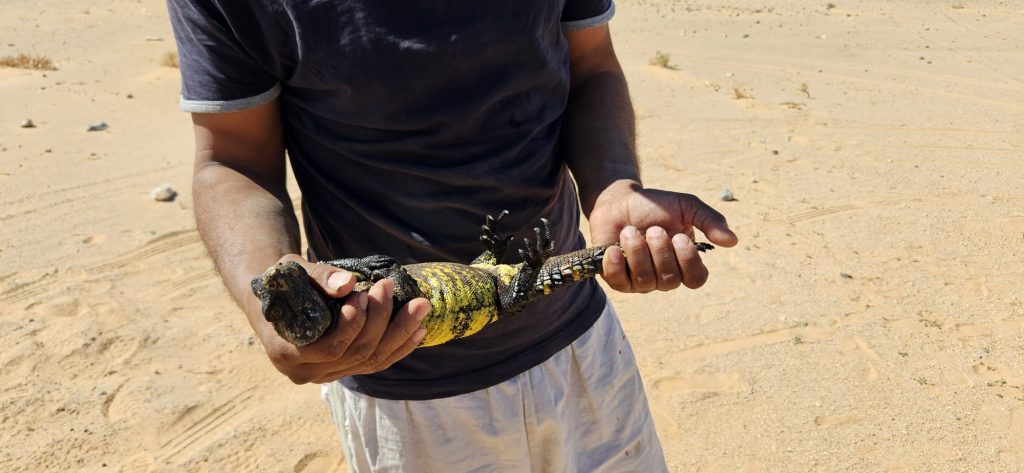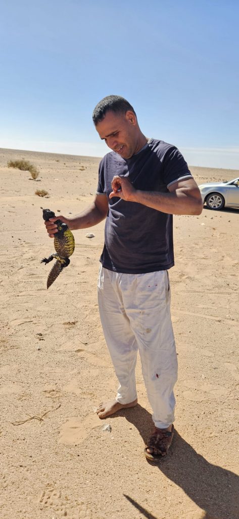 «Los lagartos de arena eran, para Saleh, la esencia del desierto.» Saleh sabe, al menos intuye que el lagarto a rayas amarillas y negras está en el origen de la historia y la cultura del pueblo saharaui y su presencia en el Sahara Occidental. En él se contiene toda la información necesaria, de la que nunca ha dejado de ser testigo. El lagarto de la badia es un animal mítico -no es un mero superviviente-, que sale de su refugio debajo de la tierra, para dar testimonio, al paso rápido de los viajeros, de cuánto acontece y ha acontecido, al ritmo pausado de su naturaleza, desde cuando los primeros pobladores del Sahara Occidental lo inmortalizaron en los abrigos de roca, que jalonan un territorio, por el que se han adentrado muchos pueblos con afán de conquista. A las pruebas nos remite este ser primigenio, presente en las pinturas prehistóricas, en las que convivió con otras especies ya desaparecidas del medio: jirafas, rinocerontes, elefantes, antílopes, que con sus cómplices y adversarios humanos compartían tiempo de caza en natural empatía, necesaria para la supervivencia.