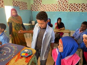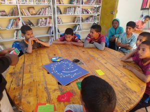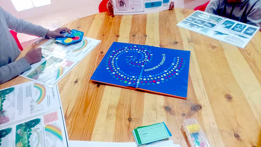 Fijaos en estas fotos: unos cuantos chavales de nuestras bibliotecas están jugando-aprendiendo con el magnífico material que les han mandado los amigos de la escuela Daina-Isard, de Olesa: “De bubisher a busbisher…”, un juego mezcla de la oca y del trivial con preguntas y pruebas sobre unas fichas de naturaleza que tienen desplegadas en la mesa: leo, me traducen al hassanía lo que no entiendo, miro los preciosos dibujos de animales y estrellas, me explican cómo funciona eso de la tormenta, me entero de cómo se forma el arcoíris y de cuántos colores tiene, tiro el dado, acierto, avanzo casillas, espero mi turno mientras veo cómo mis compañeros no saben cuántas patas tiene una araña, jajaja, me toca tirar de nuevo, ¡cielos!, me ha salido cárcel y tengo que volver al punto de partida, mala suerte, qué fácil, a ellos les ha tocado imitar el sonido y el movimiento de una serpiente, así gana cualquiera, tiramos nosotros, un seis, de bubisher a busbisher y tiro porque quiero aprender, ahora sí que les pillamos, esta es fácil, tenemos que representar entre todos los del equipo un encuentro entre un meteorito y unos dinosaurios… Pero si ya son las 6, se nos ha acabado el tiempo; Hamdi, ¿mañana podemos seguir jugando?
