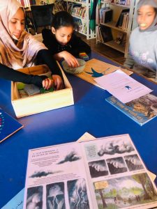 Fijaos en estas fotos: unos cuantos chavales de nuestras bibliotecas están jugando-aprendiendo con el magnífico material que les han mandado los amigos de la escuela Daina-Isard, de Olesa: “De bubisher a busbisher…”, un juego mezcla de la oca y del trivial con preguntas y pruebas sobre unas fichas de naturaleza que tienen desplegadas en la mesa: leo, me traducen al hassanía lo que no entiendo, miro los preciosos dibujos de animales y estrellas, me explican cómo funciona eso de la tormenta, me entero de cómo se forma el arcoíris y de cuántos colores tiene, tiro el dado, acierto, avanzo casillas, espero mi turno mientras veo cómo mis compañeros no saben cuántas patas tiene una araña, jajaja, me toca tirar de nuevo, ¡cielos!, me ha salido cárcel y tengo que volver al punto de partida, mala suerte, qué fácil, a ellos les ha tocado imitar el sonido y el movimiento de una serpiente, así gana cualquiera, tiramos nosotros, un seis, de bubisher a busbisher y tiro porque quiero aprender, ahora sí que les pillamos, esta es fácil, tenemos que representar entre todos los del equipo un encuentro entre un meteorito y unos dinosaurios… Pero si ya son las 6, se nos ha acabado el tiempo; Hamdi, ¿mañana podemos seguir jugando?