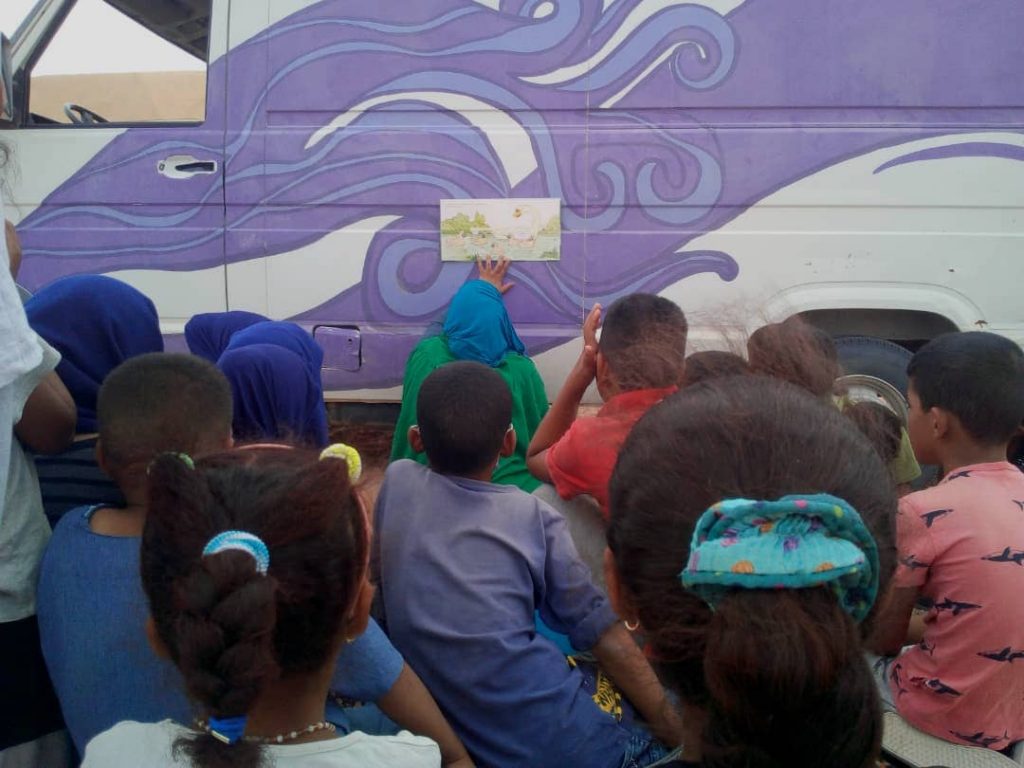A eso de las cuatro y media de la tarde, arrancan los bibliobuses desde sus respectivos nidos y se desplazan por las sinuosas y complicadas travesías de los campamentos, sorteando todo tipo de obstáculos para llegar a las dairas más alejadas. En su interior, los bibliotecarios se preparan para que la tarde se llene de libros, de risas, de palabras nuevas y de personajes de cuento.