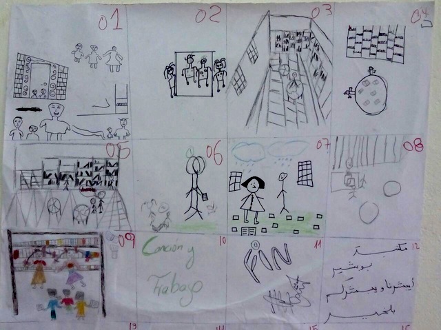Por unos días los libros y las actividades orales y escritas han dejado paso a todo lo que supone hacer una película. Si en un primer encuentro con los alumnos de la Escuela de Cine comprendimos en qué consistía el cine comunitario, en esta ocasión nos explicaron como se hacía un story board, nos enseñaron a manejar las cámaras, a hacer pruebas de sonido y a manejar la claqueta.