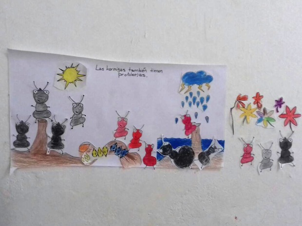 Corren tiempos difíciles hasta para las hormigas. Pero no todo acaba como empieza, porque el menosprecio de las hormigas negras hacia las rojas desaparece cuando todas juntas tienen que resolver un grave problema de supervivencia. Una historia cargada de mensajes de los que los niños y niñas de Bojador han asimilado y han interpretado en unos dibujos preciosos que, poco después, adornaban una de las paredes de la biblioteca.