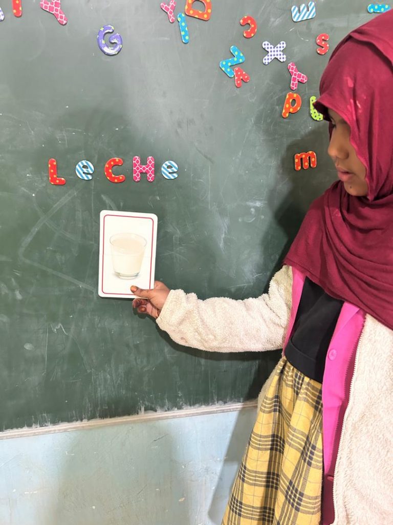 La misma magia de la lectura que esta niña va descubriendo en las bibliotecas Bubisher. Por el encerado bailan desordenadas las letras. Cada una está esperando que la niña elija la que corresponde para formar la palabra que desea escribir. Como la palabra LECHE, que encierra la sorpresa de tener cinco letras para cuatro sonidos. Dos grafemas representan un fonema, dirían las maestras. Pura magia. Pero lo verdaderamente mágico es que al leer la palabra LECHE se te llena la boca de leche, de ese primer alimento cálido y dulce que, aunque se te haya olvidado, siempre recuerdas; de ese líquido blanco que, como un milagro, todos los días nos dan las cabras del Sáhara.