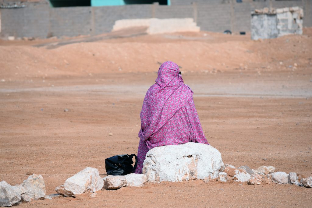 Nada se mueve a su alrededor. Ni siquiera una cabra. Nada. O solo la tierra, dando una vuelta más sobre su eje. Pero si nos fijamos en la foto hay un detalle que desmiente esa absoluta quietud: un pequeñísimo rectángulo negro pegado a su cabeza. Probablemente un móvil, en ese paisaje inmóvil, qué paradoja. Un móvil que le dice que, como para todos los refugiados, el mundo está fuera de cobertura.