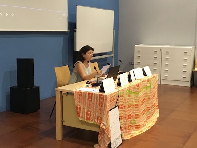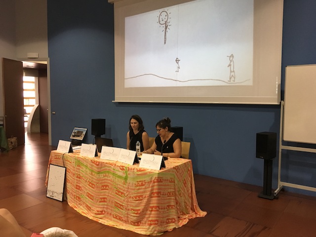 También nos relató que intentaba tres lecturas. Una primera, en la que no quería hacer una repetición del texto con las ilustraciones, quería que se complementaran, tenía que ser una luz para quien no hubiera estado nunca en los campamentos. La segunda supone complicidad con quien haya estado en los campamentos del Sahara y reconoce muchos detalles, los objetos cotidianos, las jaulas, las placas, los utensilios de las familias, las chanclas… La tercera tiene que ver con los elementos arquitectónicos, la relación con la construcción de la biblioteca, los paisajes, las figuras que a ella le interesan, le gustan, por su manera de ser, de mirar el mundo.
