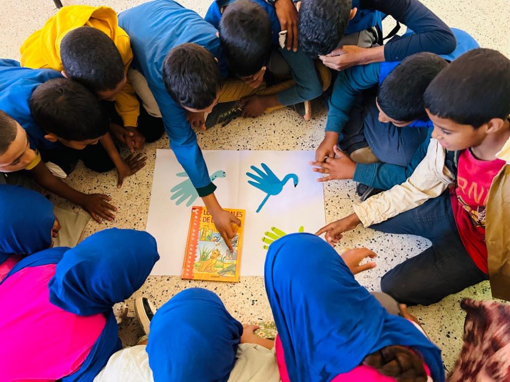 Manos que son manos y también pájaros, tortugas, elefantes. Manos que señalan la vida, que se aferran entre sí, que sostienen el peso de sus pequeños cuerpos. Manos oscuras, infantiles, que destacan curiosas entre pañuelos y cabezas de pelo cortado al ras. Por ellas sabemos lo que sueña la infancia. Manos que son mares y son lucha y es un día futuro. Manos que imaginan y construyen. Manos prestidigitadoras. Todo es posible ahora sobre el suelo de la biblioteca del desierto. Porque así, mano con mano, pájaro a pájaro, es decir, biblioteca a biblioteca, se abre una rendija de luz en un futuro que la historia y los gobiernos y los indiferentes condenan al exilio de la hamada, ese desierto de los dos infiernos, esa nada en la que se entierran hasta los sueños. Y sin embargo, las manos, las manos, los pájaros…
