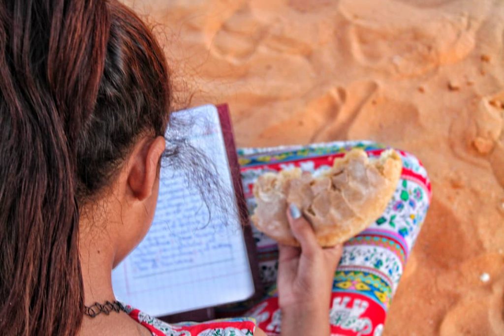 “He escrito un cuento. Te recomiendo que lo intentes también. Escribir un cuento es como soñar, pero dirigiendo tu cuento. Escribiendo un cuento puedes decir lo que no te gusta, lo que te asusta, y después inventar un personaje que haga lo que te gusta, que cambie las cosas feas y las haga más bonitas. En el mío una niña se baña en la playa de Dajla, que dice mi abuelo que es preciosa, pero que solo nos bañaremos en ella cuando volvamos a ser libres. Dice la chica del Bubi que hubo un poeta que se llamaba Federico que quería que todos los niños tuviéramos libros. Debe de ser pariente de Frederick, el ratoncito de otro cuento que nos leyó, y que mientras sus hermanos se pasaban el día buscando migas de pan o semillas de trigo, él buscaba colores, rayitos de sol y palabras bonitas. Frederick también quiere ser poeta. No, ya lo es, porque sus hermanos, que al principio estaban enfadados con él por no buscar comida, al final se lo decían, le decían “Oye, eres un poeta”. Y él, haciendo una reverencia, decía “Ya lo sé”. Yo también querría ser escritora, soñar nuestras playas. O poeta, como la abuela, que se sabe miles de versos que hablan de montes y ríos y me dice que cuando yo escriba muy bien me los dictará, para que los copie y no se pierdan . Mmm, qué rico el medio bocata que me he partido con mi hermano. Lo acabo en un plisplás y me pongo a leer.»