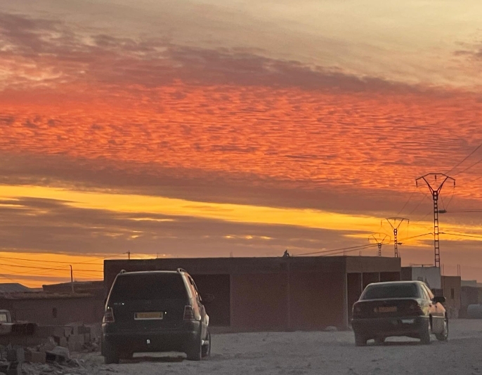 Dos automóviles circulan por una wilaya. En muchas ocasiones pude ver, y en algunas les acompañé, cómo jóvenes, a falta de otra actividad más productiva o más satisfactoria, pasaban el tiempo del anochecer, antes del rezo, circulando por las afueras de sus wilayas, sin ningún destino, sólo quemando horas vacías de sus vidas y el combustible de los depósitos de sus coches, a la velocidad máxima, que el estado de los vehículos permitía, como queriendo evadirse de una realidad dolorosa.