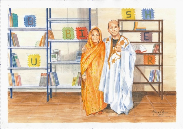 Abril del 2015. Día de la inauguración de la biblioteca de Bojador. Pilar y Taquete decidieron integrarse plenamente en el acto inaugural y con mucho orgullo lucieron melhfa y darrá. Y con mucha emoción, compartieron ese momento en el que las puertas de un nuevo Nido del Bubisher se abrían para el pueblo saharaui exilado en el campamento de Bojador.  Una cámara de fotos atrapó el instante en el que ambos dejaron constancia de su presencia e implicación en el proyecto Bubisher.
