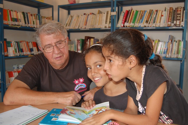 Ese día tocaba visitar la biblioteca de Ausserd e iba yo dispuesto a contar algún bonito cuento a los lectores que hubiera…y allí estaban dos jóvenes lectoras Nama y Naha, de 9 y 10 años que se me presentaron como amigas. Su entusiasmo por la lectura del cuento que estaban leyendo era tan grande que decidieron contármelo a mí. Era un cuento en árabe, de los muchos de los que ya dispone el Bubisher en cuatro de los campamentos de refugiados saharauis. Intervenían un tigre, una pequeña abeja y un ratón y ellas me lo explicaban en un español perfecto y se reían de mi lentitud para comprender la historia. También me dieron una clase de árabe y gracias a ellas ya sé decir abeja y tigre y mariposa… como las que acudieron al pequeño jardín que adorna la biblioteca de Dajla. En la sala de lectura se dibujaban unos toboganes de luz en los que flotaban caprichosamente miles de partículas de polvo que ascendían y descendían al compás de los expresivos y vivaces ojos de estas dos niñas saharauias. Eran unos trazos dorados que procedían de una de las ventanas que no estaba cerrada del todo… y por la que ellas podían viajar por todo el mundo y conocer todos los lugares que quisieran y era tanta la envidia que despertaban que una pequeña duna se ha ido arropando junto a una de las paredes de la biblioteca y ya casi llega a esa ventana…porque no sé si sabias que las dunas también quieren leer.
