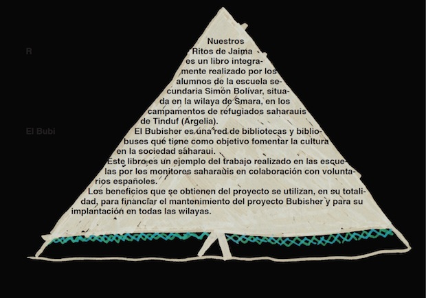 Todo comenzó cuando Kabara, una de nuestras bibliotecarias, y una voluntaria española, Inés G. Aparicio, planificaron leer con los niños de dicho centro el libro de Liman Boisha “Ritos de jaima” Después de varias sesiones de trabajo, los estudiantes se mostraron absolutamente motivados para hacer su propia interpretación de todo lo que ellos consideraban que mejor definía su cultura. El resultado final es este libro cuyos textos e ilustraciones no solo nos acercan al pueblo saharaui, sino que , además, nos permiten pensar que el trabajo del Bubisher en las escuelas y en las bibliotecas está dando sus frutos, que el interés por abrir las puertas de una cultura rica en matices se ensarta con el aprendizaje del español, con el desarrollo de la expresión artística y con la consecución de una interculturalidad enriquecedora.