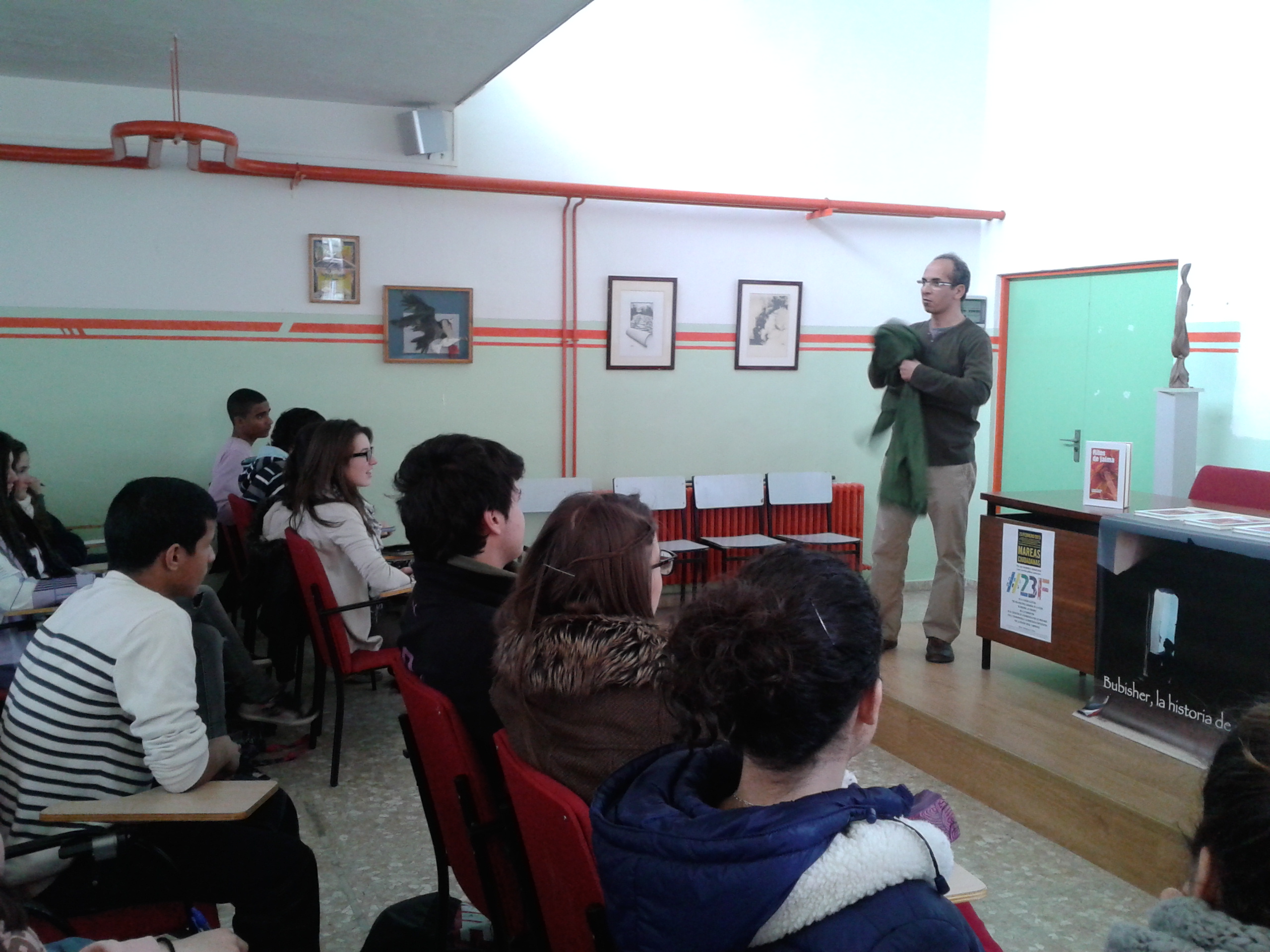 Este curso, y dentro de la etapa previa a la fiesta final, los alumnos del IES Pirámide contaron con la presencia de Limam Boisha que, con su voz serena y su peculiar forma de dejar que fluyan las palabras, les habló de la situación actual del Sahara Occidental, de la cultura saharaui y del Bubisher.