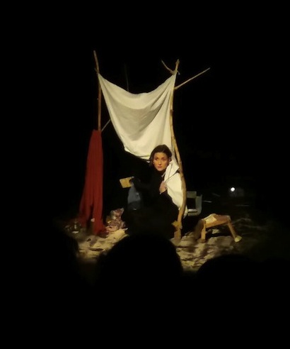 “Una sombra femenina recorre el escenario casi oscuro, en el que dos árboles desnudos son todo el decorado. Se mueve casi por el aire, envuelta en una mehlfa negra. Susurra: hay una historia, hay una historia… Luego se inclina sobre el suelo, y parece brotar de la tierra, o más bien de la arena, un taco de madera. Ella vuelve a hablar: un niño, un niño… Y el taco de madera, animado por sus manos, se transforma en niño, tan desnudo como al nacer.