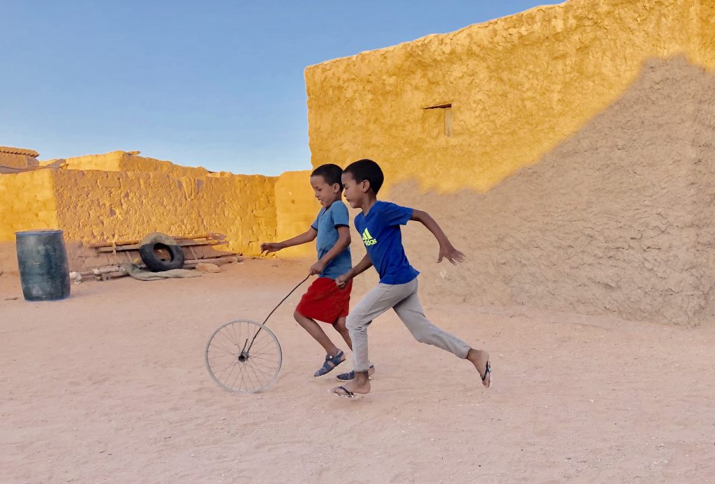 Taleb juega con una rueda que simboliza un coche, y con un amigo. No tiene cachivache de videojuegos, ni tableta, ni tele de plasma. Tiene imaginación simbólica, tiene risa, tiene piernas para correr, energía para iluminar un par de jaimas. Taleb y su amigo son dos niños. Y hoy es su día, un “Día Internacional” más. En el que se hablará de la pobreza, pero se ignorará la riqueza de momentos como este en el que dos niños refugiados baten el record del circuito de la jaima, la riqueza de la imaginación. Siento rabia por la situación del pueblo saharaui, tan olvidado como torturado, siento pena por las necesidades de sus niños, por sus escuelas precarias y por sus cincuenta grados a la sombra, pero siento gozo al contemplar esta foto, al revivir ese instante, porque me habla del poder infinito de la mente del niño. Desde ella, ningún futuro es imposible. Y luchar por hacerla aún mas fuerte es una de las cosas más bellas que se pueden hacer en esta vida.