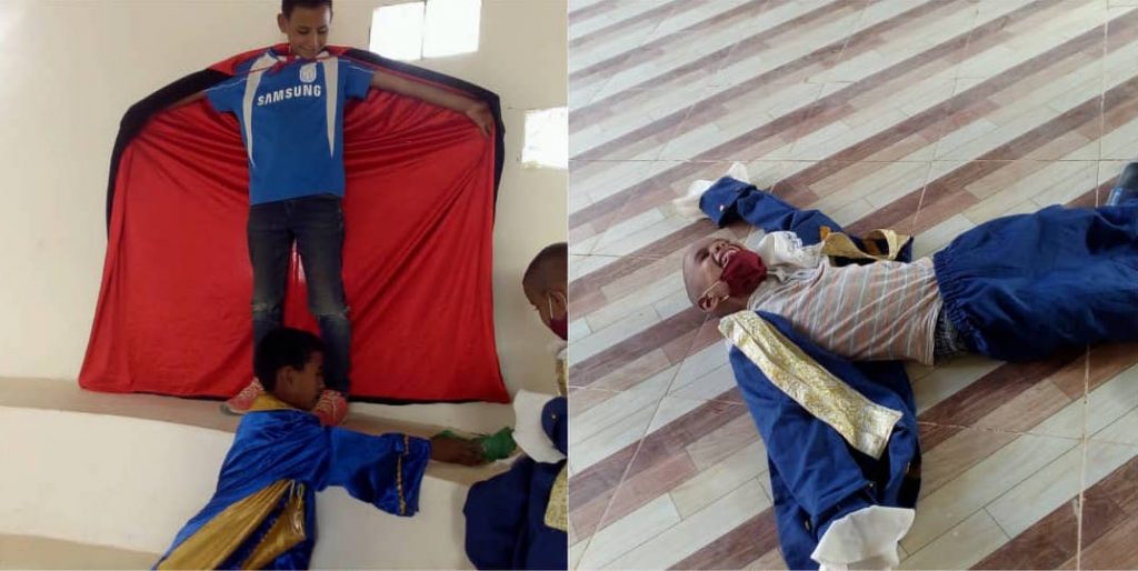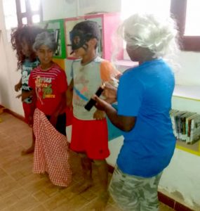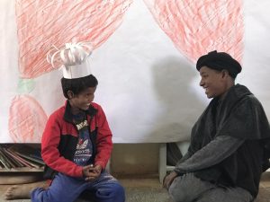 Con muy pocos medios, pero con una creatividad desbordante, se levanta un telón imaginario y tras él, historias de reyes y de animales, de payasos, de vidas sacadas de los cuentos. Trabajo en equipo, timideces fuera, nuevas palabras, alegría, aplausos del público.