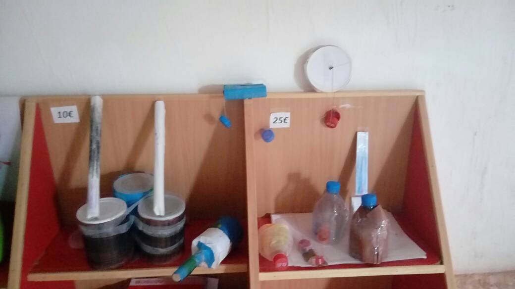 musicales con material de reciclaje, después de leer “Sofía, la vaca que amaba la música”, como aviones de papel asociados a un libro en árabe y