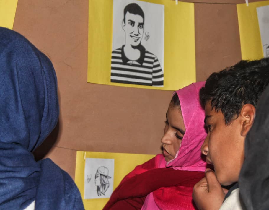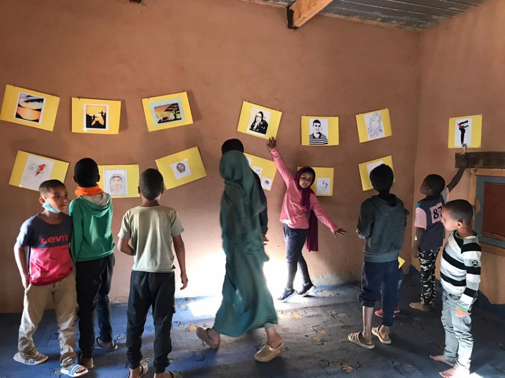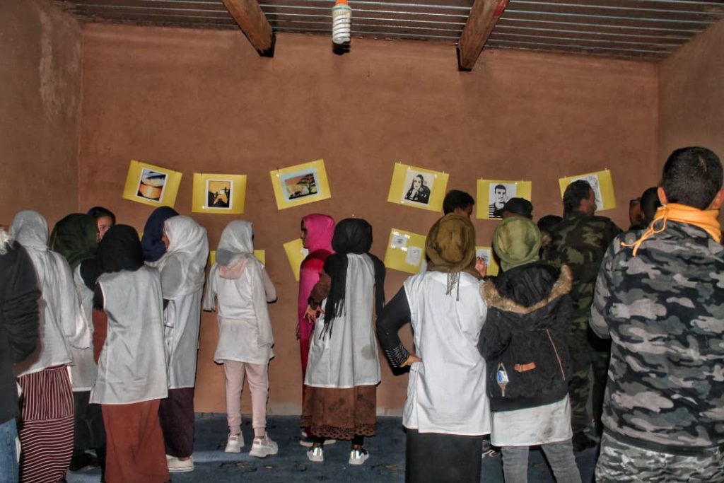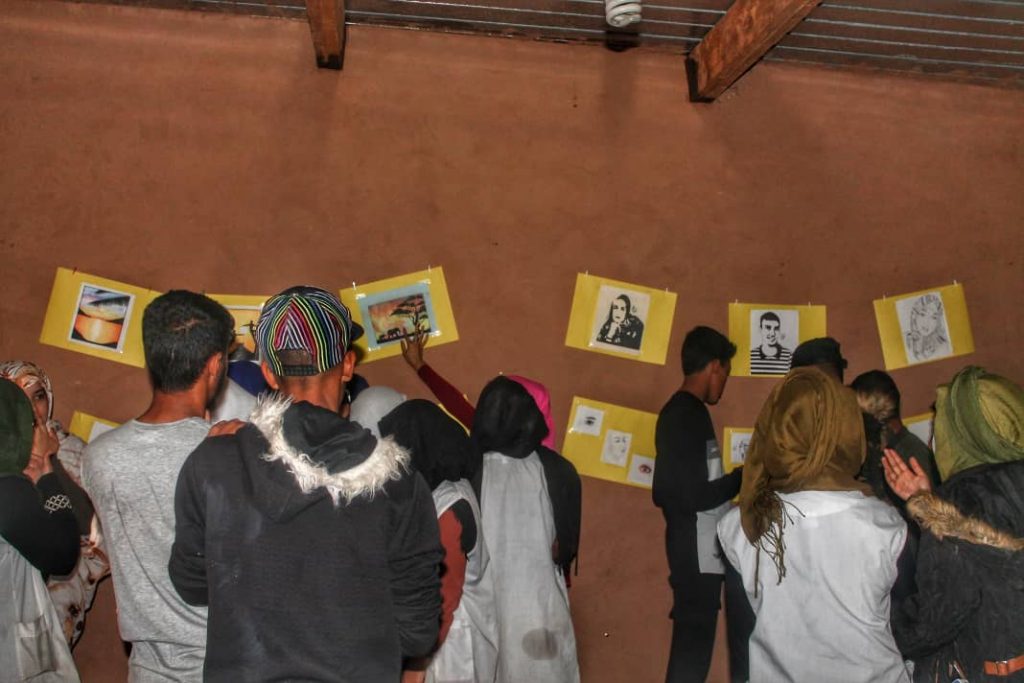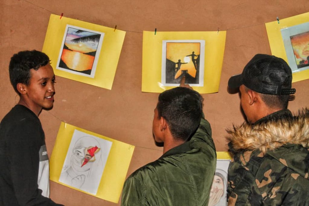 La exposición Revolución-Arte, se inauguró en Smara con una gran afluencia de jóvenes que, antes de hacer un recorrido por la sala, asistieron a un taller artístico en el que, además de explicarles la importancia del arte en la vida de un pueblo, se les invitó a hacer un dibujo con la mano que no utilizan con el fin de que sean conscientes de que cualquier primer intento es costoso, incluso parece imposible, pero que todo se llega a conseguir si la pasión con la que se hace es el motor que impulsa a romper todos los muros. Incluso los del silencio