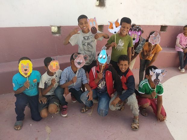Las tardes en la biblioteca son toda una aventura. Niños y niñas de todas las edades entran y salen, todos quieren participar y responden con una sonrisa a las actividades que proponemos. Nos planteamos la idea de crear una obra de teatro para participar en un certamen que se celebrará tres días después. Sin pensarlo nos ponemos manos a la obra. Brahim organiza los textos y comienza a ensayar con los pequeños actores. Madja y yo reunimos a otro grupo de niños y comenzamos a elaborar los títeres y el atrezzo para la obra. A pesar del poco tiempo que tenemos el resultado es realmente bueno, fruto de la implicación y el esfuerzo de todos los participantes.