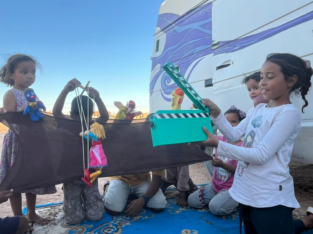 Hoy, plantado ante el ordenador, intento exprimir esta otra foto, preciosa, con un no menos maravilloso plató en el que una niña dirige, claqueta en mano, a otro, que a su vez dirige una marioneta ante la atenta mirada de la niña que sujeta un personaje de guiñol. Detrás del telón aparecen otro par de personajes infantiles guiados por otros profesionales del no celuloide. Sin duda, una superproducción, como bien dejan ver las sonrisas de las niñas de la derecha, un público nada exigente, pero entendido.