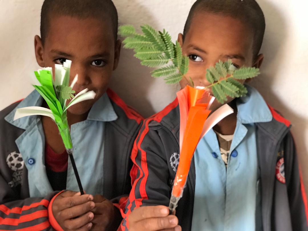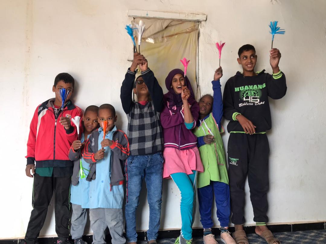 Esos niños que sostienen flores de papel y ramas de talja son en su mayoría sordos o ciegos de una modesta escuela para niños y niñas con discapacidad de Smara, cerca de la biblioteca. Y hasta allí se han ido las bibliotecarias, para convocar también con ellos el milagro de las flores.
