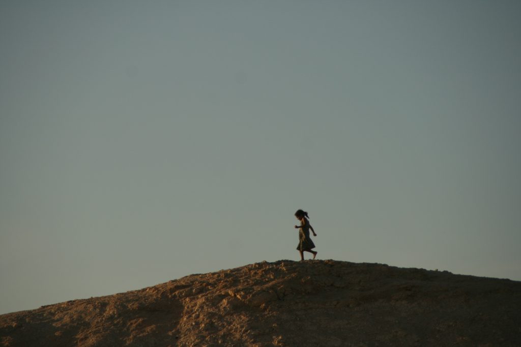 Bajo un cielo sin estrellas, caminan unos pies descalzos sobre la pedregosa colina, sombra de niña cuyas huellas borrará el viento, quizá también el olvido. Silencio. Su pequeña presencia brilla en lo sencillo. Lo que sigue, lo que nunca termina…es el camino.