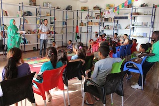 Fatrana y Alghailani, además de entregar los premios a los ganadores del concurso, leyeron y trabajaron con los niños varios libros relacionados con los propios libros y con las bibliotecas.